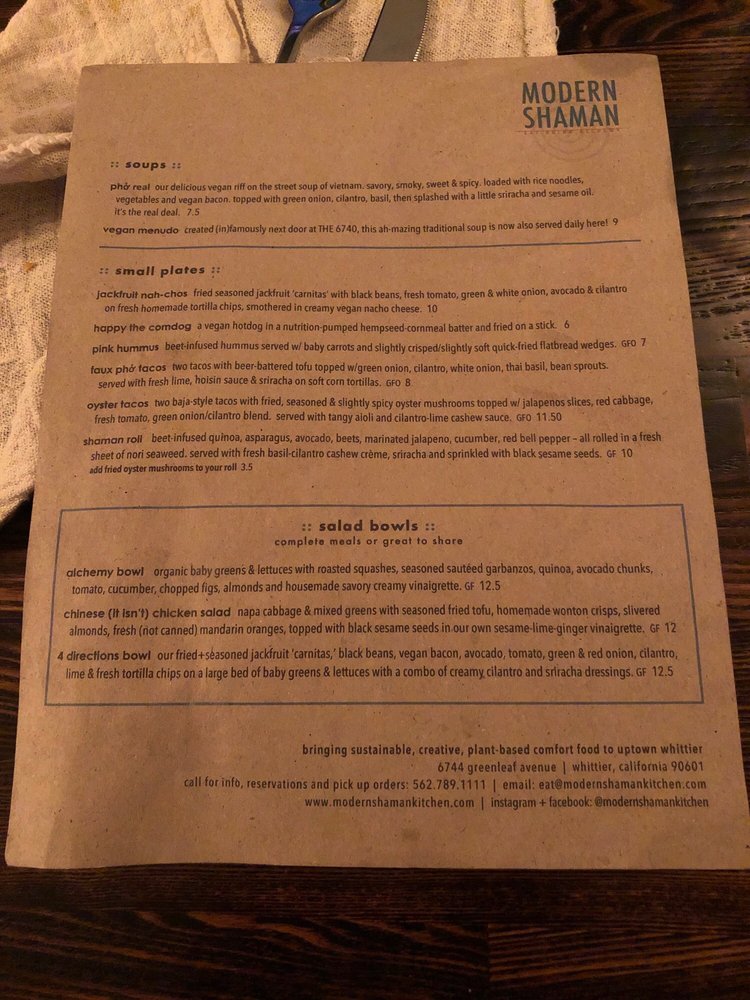 Welcome to Modern Shaman, a delightful culinary haven located at 6744 Greenleaf Ave, Whittier, CA. This vegan eatery seamlessly blends innovative flavors with a warm, inviting atmosphere. As you step inside, the minimalist decor creates a cozy yet modern vibe, ideal for casual dining. The friendly service enhances the experience, with staff eager to recommend their standout dishes.